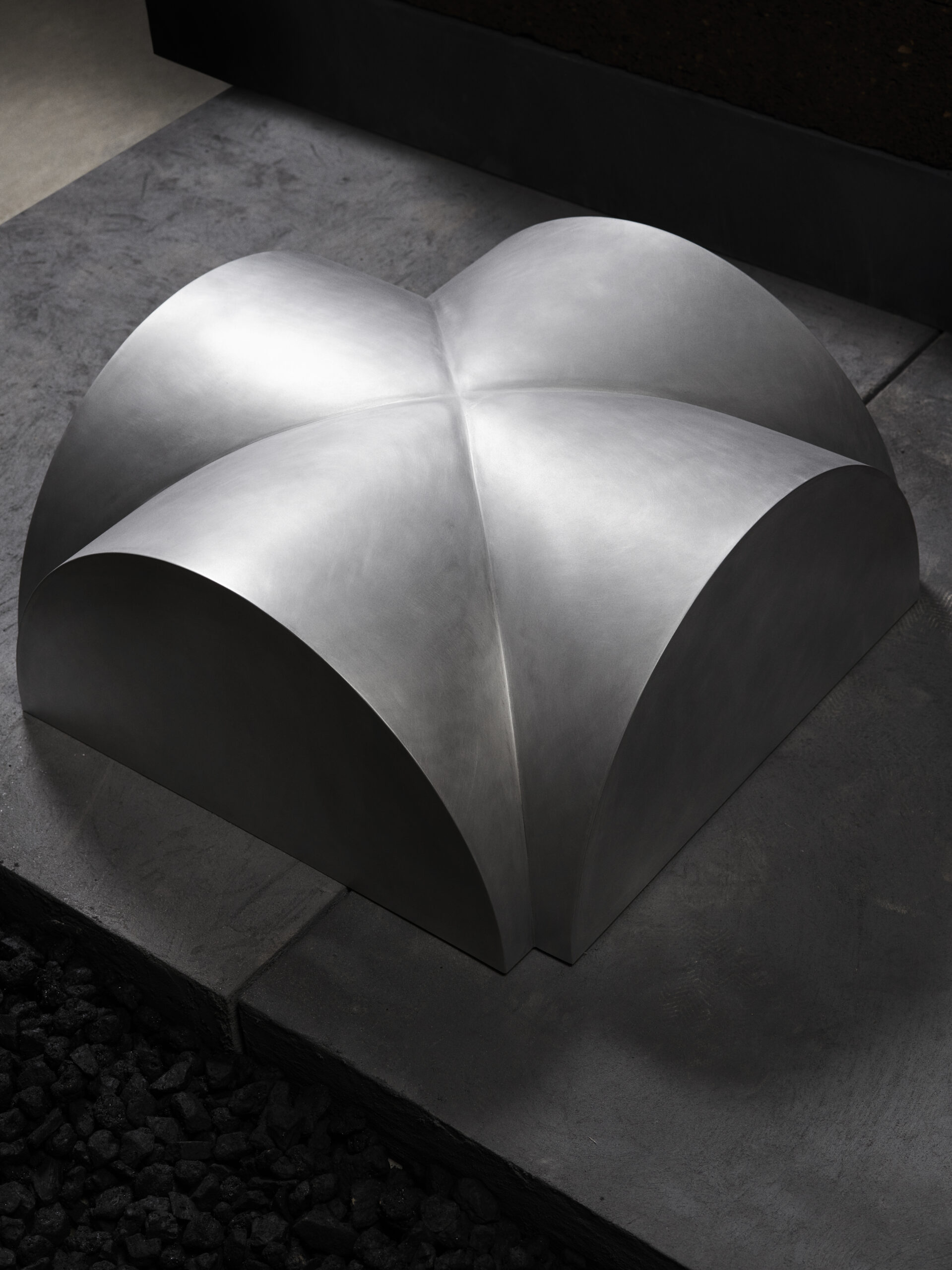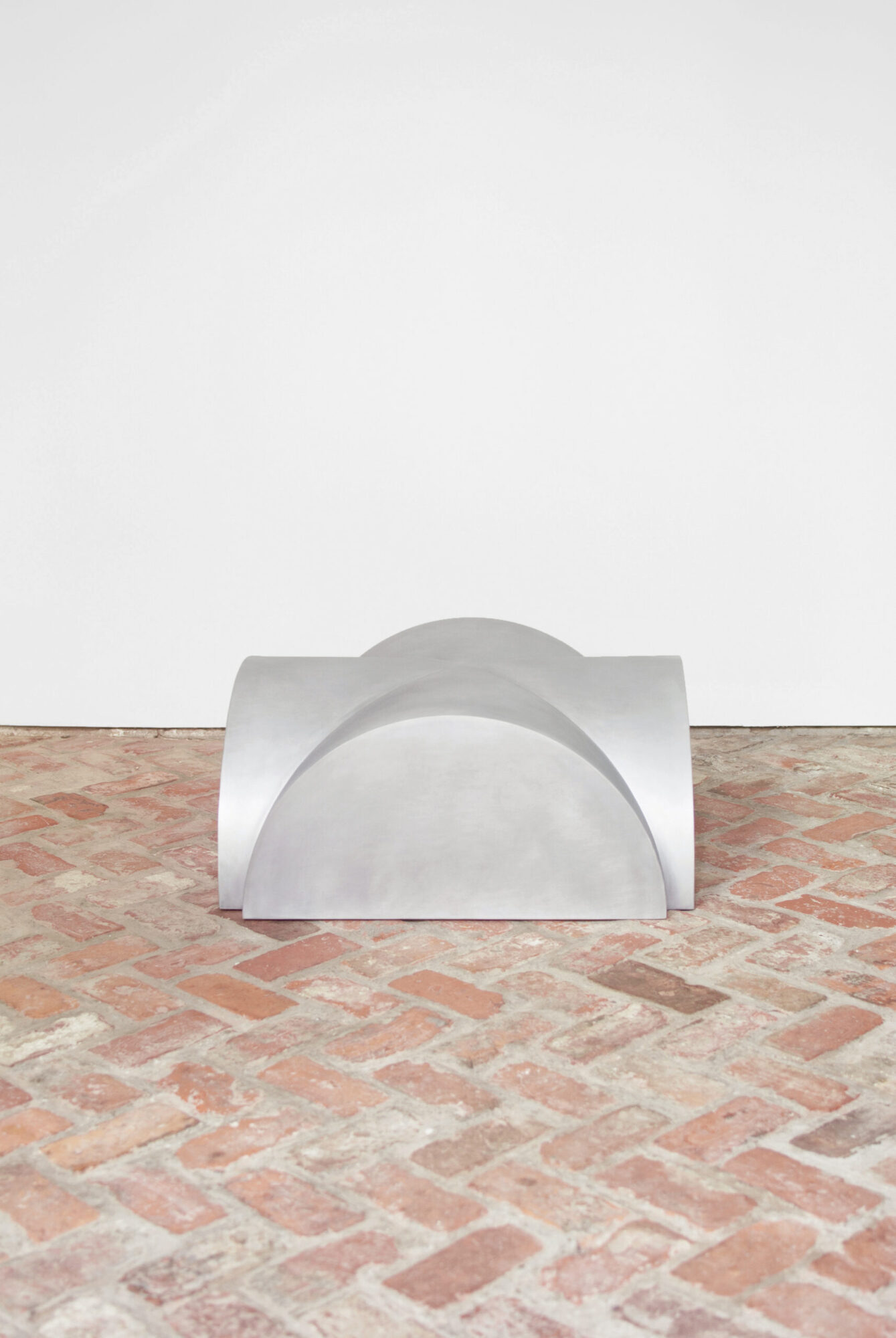 Cross Vault intervenes the architectural element into a sculptural furniture piece. Both contemporary and classical fragments are the bases of the visual language of the Cross Vault. Fascinated by old building techniques, the classical cross vault, usually made out of layered bricks, has been reinterpreted through another materiality. This Cross Vault is a clear exploration in shape, translated into an open furniture piece; a low seating element. The transition of the crossed structure, built from bended aluminium, still refers to the building technique but the scale opens new functions. The aluminium volume of Cross Vault, show the fusion between sculptural and industrial in ultimate way. The finish of the surface, sanded by hand, leaves a cloudy texture that shows the human touch of the architectural shape. These traces that are still visible in the object, explain the method of Destroyers/Builders.