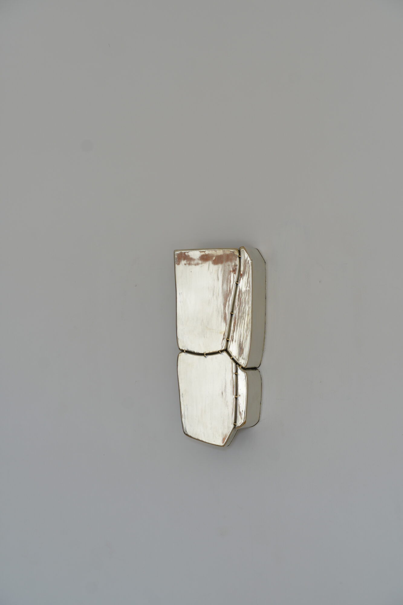 While the architecture of central India guides her forms, the exploration of repoussé takes on an inspirational guise that leads to the development of a new technique. The principle of the traditional method remains, but its form is entirely reinvented; rather than using a thin sheet of metal, a thick surface of German silver entirely envelops hand-carved teak wood blocks, molded into the desired shapes. It is thanks to the innovative proposition strength of the gallery’s partner workshop based in Alibag, across Mumbai, and headed by Jeevaram Suthar, that this technique was born. These blocks are then joined together through brass soldering points. The fusion of untouched welding reflects a commitment to honesty in the process, where details serve as a visual language. Wooden molds provide structural support, hidden within the final piece, while metal components are bound by the strength of the solder.